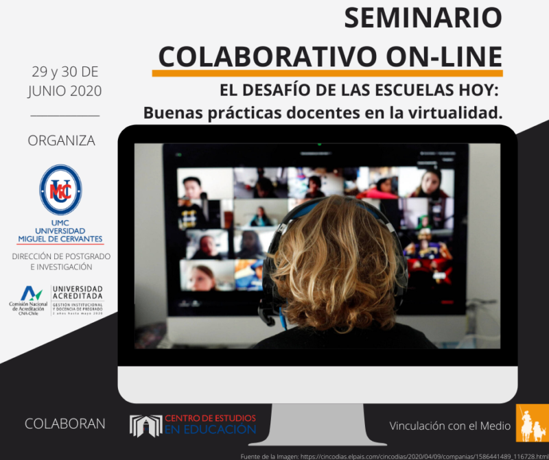 [vc_row][vc_column][vc_column_text] Los días 29 y 30 de junio de 2020, la Dirección de Postgrado e Investigación y el Centro de Estudios en Educación de la Universidad Miguel de Cervantes, desarrollaron el primer Seminario Colaborativo On-Line titulado “El desafío de las Escuelas Hoy: Buenas prácticas docentes en la virtualidad”. Este evento de carácter internacional tuvo por […]