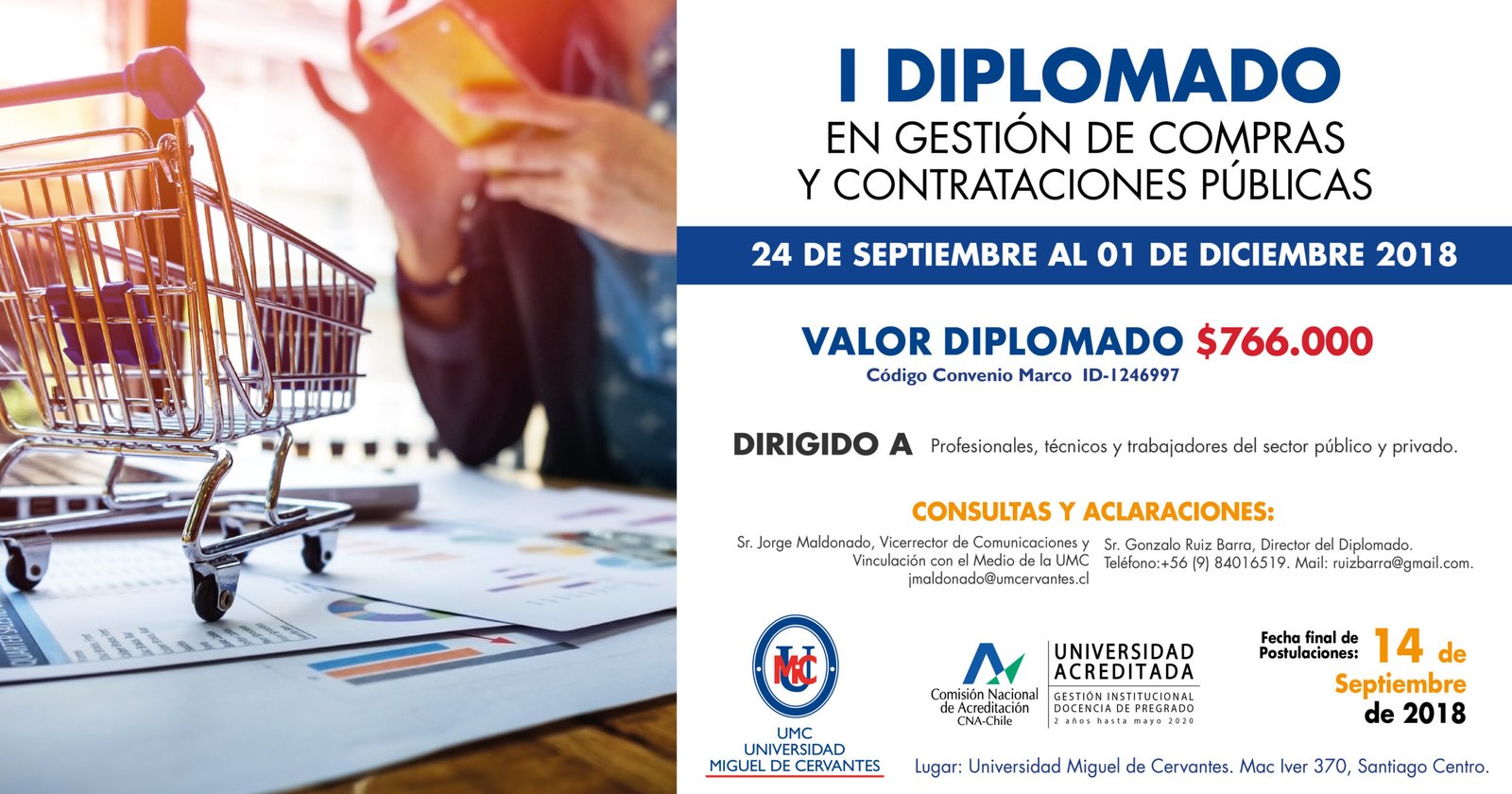 [vc_row][vc_column][vc_column_text]La Universidad Miguel de Cervantes convoca a los profesionales, técnicos y trabajadores del sector público y privado que deseen adquirir y profundizar conocimientos en el área de las compras públicas a formar parte del “Diplomado en Gestión de Compras y Contrataciones Públicas”, cátedra con enfoque práctico en la aplicación de la Ley N° 19.886 de Compras Públicas y su Reglamento, así como en el uso del portal www.mercadopublico.cl, plataforma dispuesta por el Estado para la transacción de bienes y servicios entre proveedores y los Órganos Públicos.