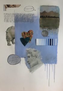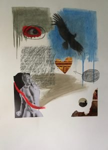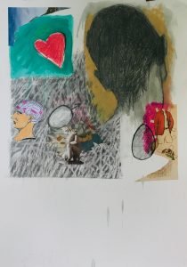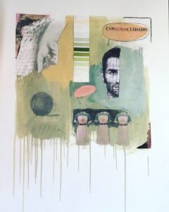 El soporte de mi trabajo es generalmente papel de alto gramaje que me permita el uso de distintos materiales como óleos, esmalte, acrílico, grafitos, lápices de todo tipo, y recortes de diferentes impresos; muchas veces incluyo textos míos y pinturas o dibujos de pequeño formato de mi autoría.