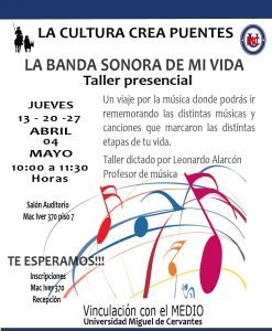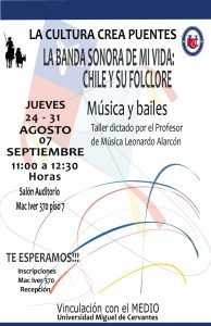 La Universidad Miguel de Cervantes realiza talleres para Adultos Mayores: “La Banda Sonora de mi Vida” y “La Banda Sonora de mi Vida: Chile y su Folclore”. Dirigido por el profesor de música Leonardo Alarcón, el taller pretende ser un viaje por la música donde los participantes puedan rememorar las distintas músicas/canciones que marcaron las distintas etapas de en la vida de cada uno de ellos.