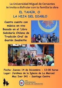 La Universidad Miguel de Cervantes deslumbró a niños, niñas y adultos con la presentación de la obra teatral “El Tahúr, o la hija del diablo” en los Jardines del Museo de la Merced. La pieza, inspirada en el “Libro Sabiduría Chilena de Tradición Oral” de Gastón Soublette, fue llevada a escena por la talentosa Compañía de Teatro “Cielo Abierto”.